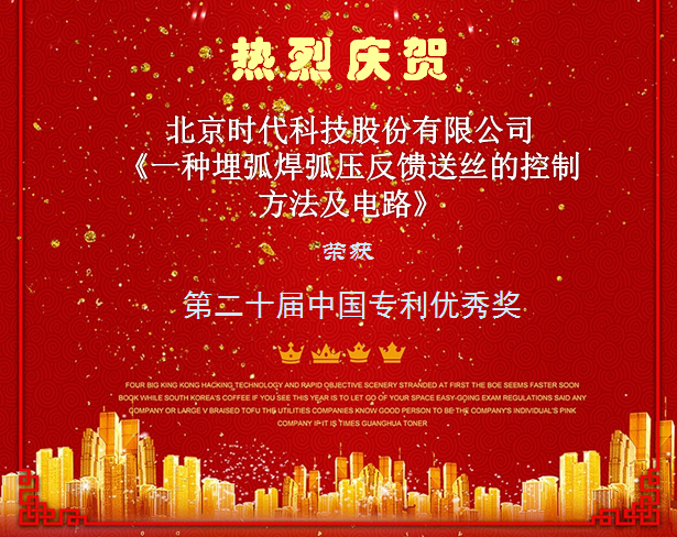 國家知識產權局于2018年12月26日發布“關于第二十屆中國專利獎授獎的決定”,北京時代科技股份有限公司專利《一種埋弧焊弧壓反饋送絲的控制方法及電路》榮獲第二十屆中國專利優秀獎。