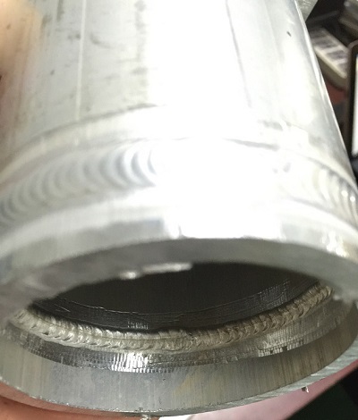 第二模塊鋁合金構(gòu)建中鋁管的焊接難點(diǎn)主要在于背部融透(如圖6)和內(nèi)在質(zhì)量的保證。背部融透主要是考驗(yàn)選手對(duì)熔池的理解,在組對(duì)焊縫0間隙的情況下,如何能夠識(shí)別熔池溫度是否達(dá)到,送遞焊絲時(shí)間的選擇,這些都至關(guān)重要,而且在焊接過(guò)程中,由于鋁合金的導(dǎo)熱系數(shù)大,焊接過(guò)程中隨著溫度的上升,焊接速度也會(huì)越來(lái)越快,如果手法跟不上,只是依靠小電流慢速焊,這樣就會(huì)在某一點(diǎn)(比如引弧處)不停的加熱,局部時(shí)間加熱久了焊縫內(nèi)部會(huì)很容易出現(xiàn)過(guò)熱裂紋,焊縫表面發(fā)白無(wú)光澤,所以鋁合金焊接一般要求大電流快速焊接,也是為了在引弧初期就能夠快速打開(kāi)鋁合金表面的Al2O3薄膜。該薄膜熔點(diǎn)高達(dá)2050℃,極大地超出了鋁的熔點(diǎn)(660℃),由于這層薄膜的保護(hù),所以鋁不易產(chǎn)生腐蝕,但在焊接時(shí),Al2O3會(huì)阻礙熔池金屬良好結(jié)合,容易形成夾渣氣孔等缺陷,可以說(shuō)是焊接的障礙,所以在鋁合金焊接中要想達(dá)到探傷一級(jí)確實(shí)很難。一般要先進(jìn)行酸堿水清洗或機(jī)械清理等前期處理。還要保證干燥不潮濕的情況下焊接才能夠保證質(zhì)量,當(dāng)然對(duì)于選手的焊接操作技能也是首選。這次參賽的65名選手中,該項(xiàng)射線探傷滿分40分的情況下只有一人滿分,30分以上的有7人,內(nèi)在質(zhì)量不得分的占多數(shù)。這與鋁合金焊接普及面較窄也有關(guān)系。隨著這項(xiàng)賽事的不斷進(jìn)展。我想在不久將來(lái)大家一定會(huì)攻克難關(guān),充分掌握好這門技術(shù)。