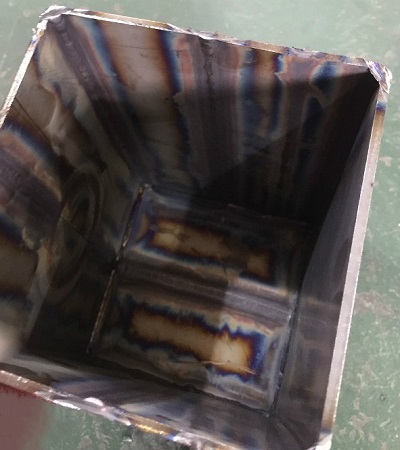 對(duì)于第三模塊中不銹鋼結(jié)構(gòu)件的焊接,個(gè)人觀點(diǎn)是其焊接難點(diǎn)要更甚于鋁合金的焊接。眾所周知不銹鋼在高溫狀態(tài)下非常容易氧化,而且變形量也較大。這次的不銹鋼結(jié)構(gòu)件組對(duì)完畢后,所有焊縫根據(jù)要求都不允許留間隙、開(kāi)坡口焊接,并在背部充氣的情況下實(shí)現(xiàn)單面焊雙面成型(如圖7),它的焊接難點(diǎn)之一首先是為防止變形,如何選擇好組對(duì)之后的焊接順序,其次是焊接過(guò)程中如何能夠保證一次焊接背部成型和表面焊縫成型不氧化,乍聽(tīng)起來(lái)好像這兩點(diǎn)有些矛盾,首先要想保證在不留間隙的情況向背面焊透,就要使熔池的溫度充分達(dá)到,而熔池溫度一旦過(guò)高焊縫表面就很容易氧化發(fā)黑,本屆比賽各路選手也是各顯其能,對(duì)于氬弧焊噴嘴的使用從6號(hào)嘴到10號(hào)甚至更大都有使用。其實(shí)從理論上來(lái)講,要想使氬弧焊接不銹鋼表面成型好,顏色好,主要就是氣體的保護(hù)效果,如果比賽允許使用氬氣保護(hù)拖罩進(jìn)行三重保護(hù),即熱影響區(qū)也保護(hù)起來(lái),那么焊縫達(dá)到銀白色的金屬光澤也是有可能的,但這次只允許兩重保護(hù)(即內(nèi)充氣和氬弧槍本身氣體),那么對(duì)于焊縫的正表面只能采取大口徑噴嘴進(jìn)行,才能擴(kuò)大保護(hù)范圍,如果條件允許,也可以采用噴嘴內(nèi)裝有濾網(wǎng)的大口徑噴嘴進(jìn)行焊接,這樣的氣體保護(hù)會(huì)更均勻。但前提是采用大噴嘴口徑的焊槍對(duì)焊接過(guò)程中選手對(duì)熔池觀察的視線會(huì)有所影響,也要逐漸適應(yīng)。這次大賽對(duì)于大噴嘴的使用只有少數(shù)單位想到了這一點(diǎn)。隨著本次大賽的結(jié)束,我想以后對(duì)于不銹鋼焊接的氧化問(wèn)題,會(huì)有更多的單位熟悉、掌握,甚至想出更好的辦法來(lái)解決不銹鋼焊接氧化的問(wèn)題。