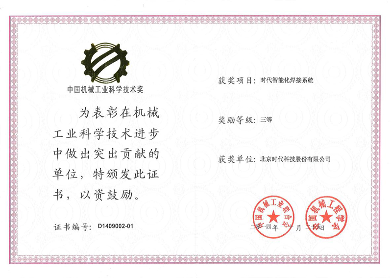 | 2014-12 | 中國機械工業科學技術獎 時代智能化焊接系統 | 中國機械工程學會 |