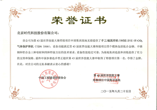 | 2015-08 | 第43屆世界焊接大賽焊接項目集訓用機 | 中國工程建設焊接協會 |