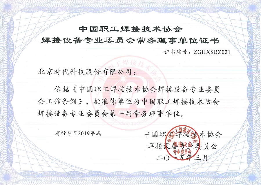 | 2016-04 | 中國職工焊接技術協會 焊接設備專業委員會常務理事單位證書 | 中國職工焊接技術協會 焊接設備專業委員會 |