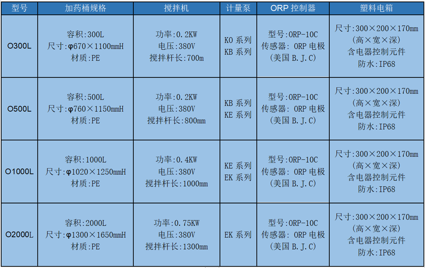 ORP控制器加藥系統: ORP控制器加藥系統由以下四部分組成: 1、ORP控制器+電箱(提供控制范圍) 2、計量泵(提供流量××L/H) 3.攪拌機(提供功率、轉速) 4.加藥桶(提供容量材質)