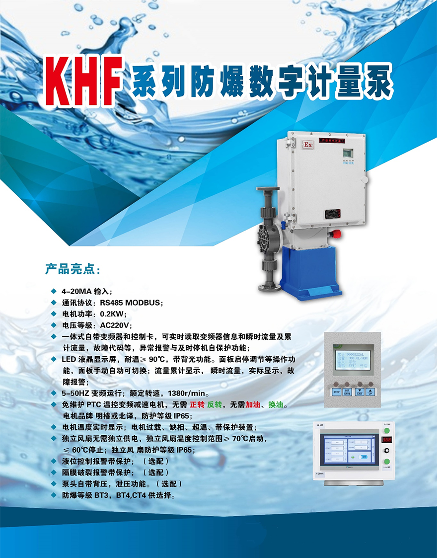 自主研發(fā)的的智能型KHF系列數(shù)字計(jì)量泵,為客戶提供化學(xué)品精確投加智能化解決方案。數(shù)字計(jì)量泵機(jī)械結(jié)構(gòu)簡(jiǎn)單,安裝維護(hù)方便,獨(dú)特的驅(qū)動(dòng)設(shè)計(jì),使得流量控制簡(jiǎn)單又精確。泵融合多種智能設(shè)計(jì)于一身,結(jié)合流量、液位、壓力、時(shí)間等方面予以控制,通過集成的微處理器予以自動(dòng)化運(yùn)算和反饋,友好的按鍵式人機(jī)界面系統(tǒng)讓操作更便利化。